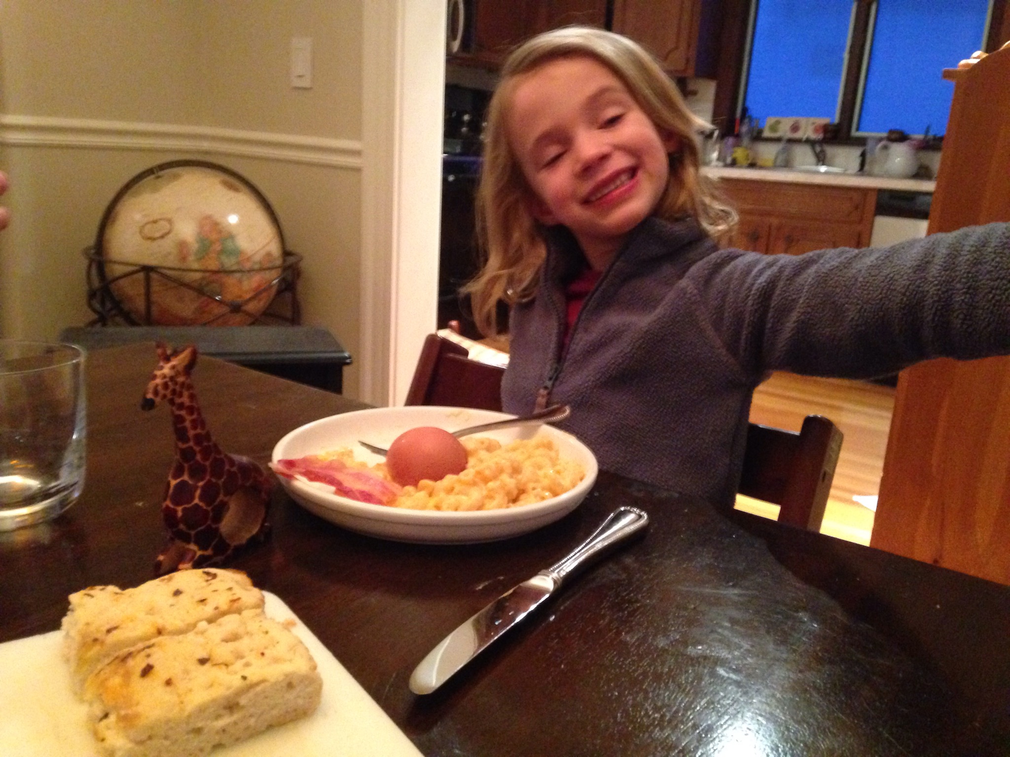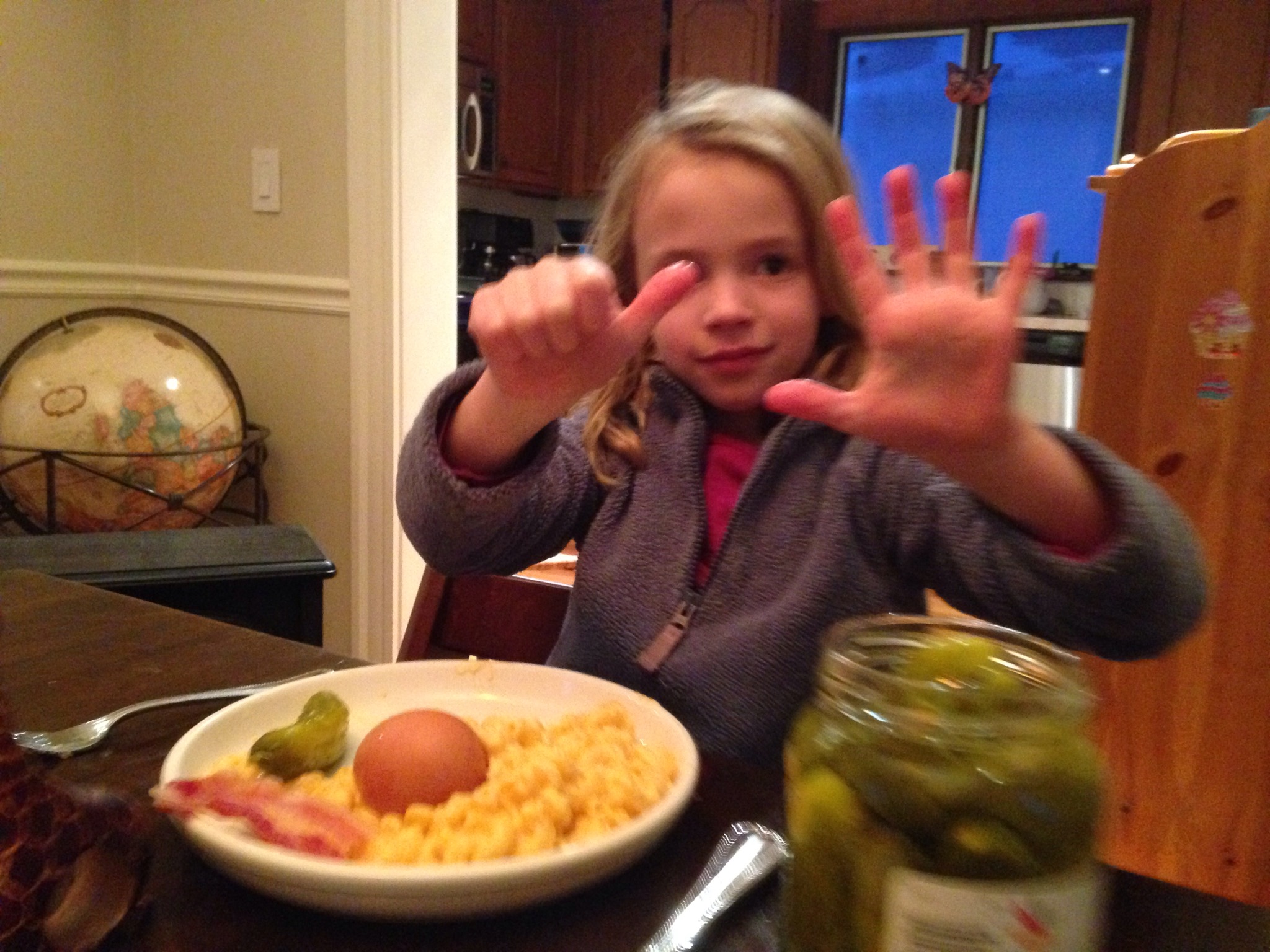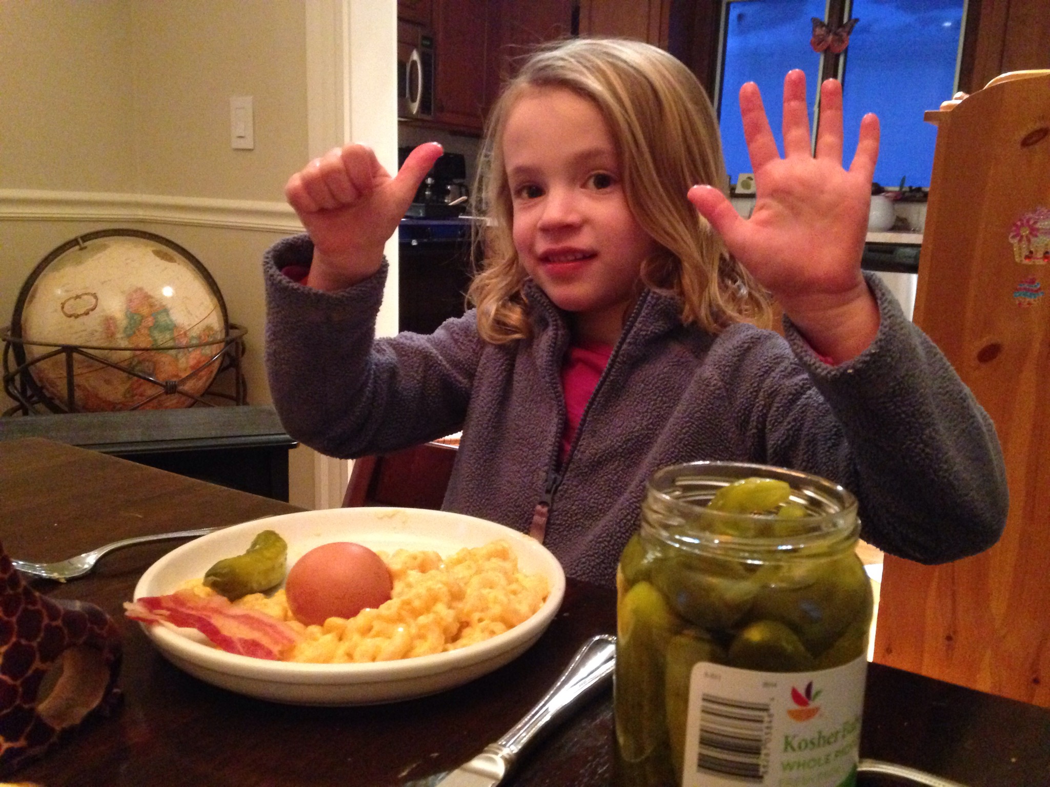 Menu chosen by Maisie: Mac & cheese, pickles, hard boiled eggs, bacon, and ginger ale